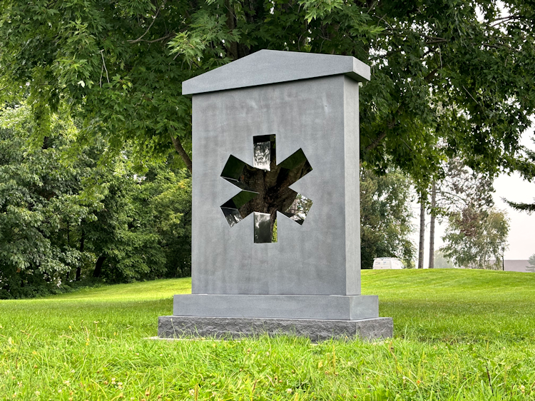 La caractéristique architecturale la plus frappante est la découpe polie au centre, dont la forme rappelle l’étoile de vie d’un secouriste, un symbole universellement reconnu dans le domaine paramédical. Les bords de la découpe de l’étoile sont fraisés avec précision, ce qui lui confère un aspect contemporain qui illustre la pertinence de la profession. Cette découpe permet de voir l’environnement naturel, comme les arbres et la ligne d’horizon, à travers le monument, créant ainsi un lien visuel entre le monument et son environnement.
