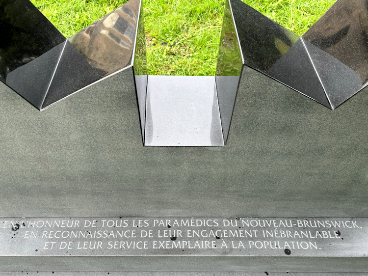 Le monument est en marbre avec une finition lisse et sciée, ce qui suggère la durabilité et la solennité. Il est monté sur un socle qui le surélève légèrement du sol, lui donnant ainsi de l’importance sans pour autant écraser son cadre naturel. La conception générale du monument allie simplicité et signification symbolique, ce qui en fait un hommage respectueux aux travailleurs paramédicaux du Nouveau-Brunswick. L’emplacement du monument a été choisi après consultation des chefs autochtones et des archéologues locaux.
